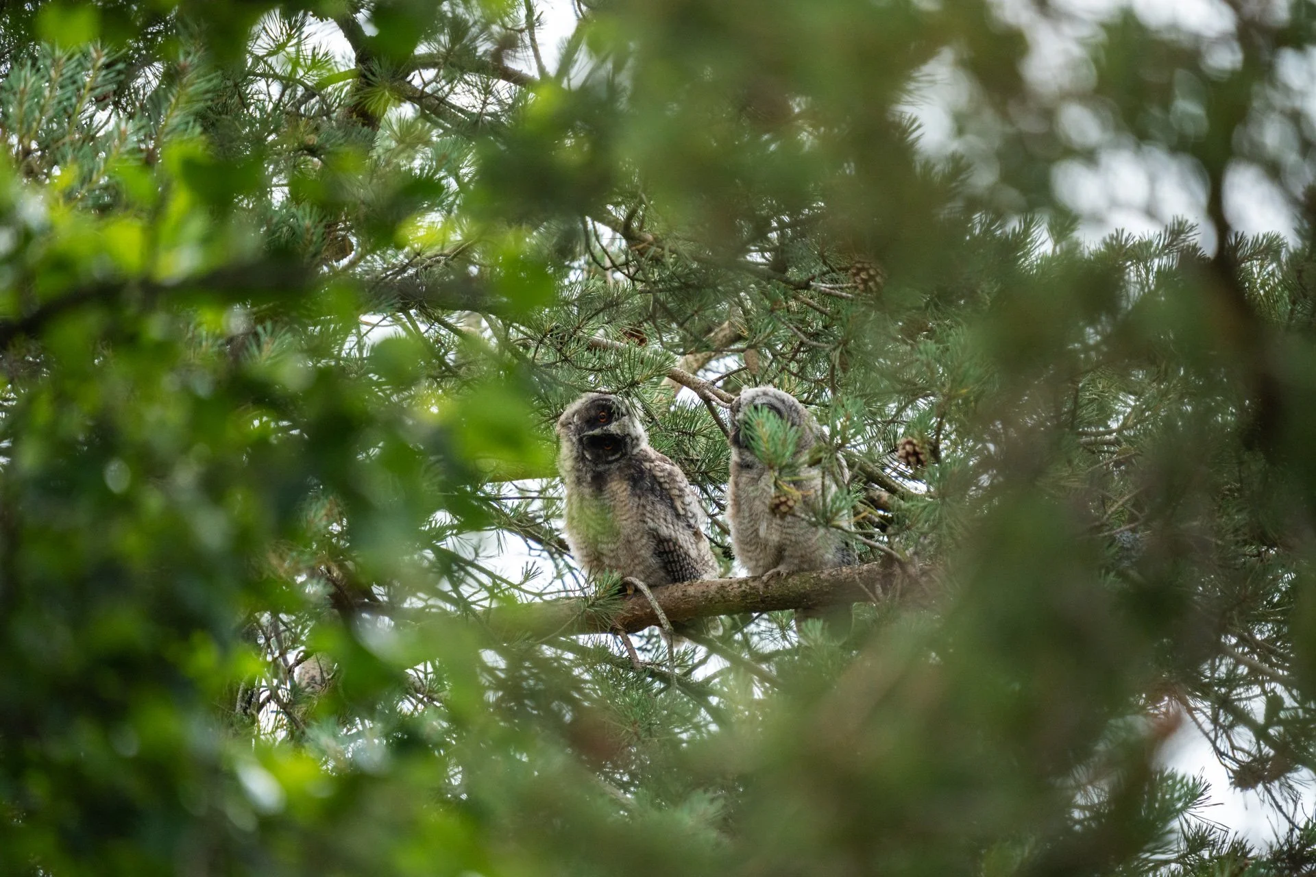 Not long after we settled in, the one owlet in the open, moved off to the branch with its sibling and now both were quite obscured by the tree branches. Another photographer who was there found a bit of a hole though the trees where you could get a clear ish shot of the owl on the left, so we took it in turns to get some images.