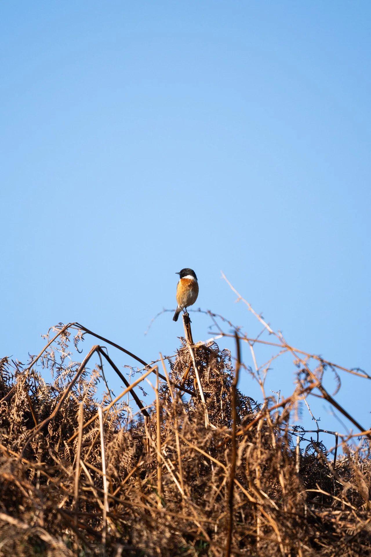 I then moved on to where I had seen some stonechats over winter on my walks with Skylar. There was no cover here, which was causing me some issues, however, I did manage to get one image of a male stone chat on the dead ferns, before he moved on. It was a bit distant to make it a real keeper, but it was nice to get a photo of one.